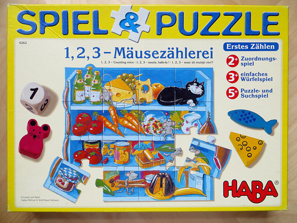 In this game Haba combines three classic product groups into one game. The games contains three thematically connected games adapted to the age of the children. The game ideas increase in difficulty with age and are a classifying game for 2 year olds, a simple dice game for 3 year olds and a jigsaw-puzzle and searching game for 4 year olds. Each of the games teaches counting to children.