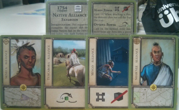 15 cards plus 2 cards of rules that add a Native Alliance power to each faction in the game. The ziploc also comes with an Alternative Setup "card" detailing two alternatives for setup steps 4 (forts) and 5 (muster markers) of the base game.