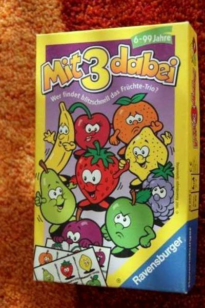 This is a fun card game in which players try to collect as many cards as possible. The first three players lay the card on top of their deck in the middle of the table. Now everybody tries to find a row or column on their top card of the deck with the same fruits as those on the three cards in the middle. When someone has found a row or column he may take the cards from the middle of the table and place them on the bottom of his / her deck. When one person doesn't have cards in his / her deck anymore, the game stops and the person with the most cards in his / her deck wins.