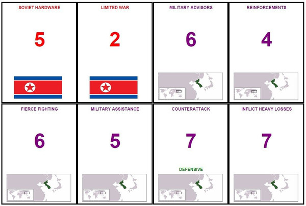 A two-player card game set in the Korean War. One player is the U.N., the other is the Communists. Each hand the players are dealt eight cards (Logistics Phase), after which they can discard and redraw up to four (Deployment Phase), and then the players reveal their offensive and defensive cards (Attack Phase). After resolving the interaction of the cards played in the Attack Phase, the hand is scored and the player with the highest card total wins the hand.