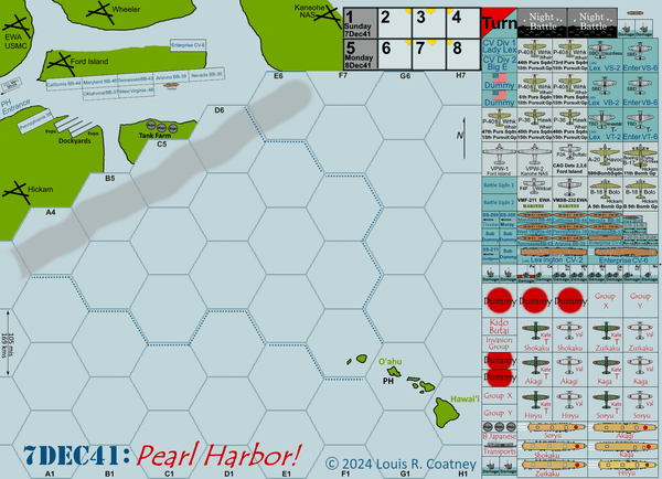 2 4-phase (night, morning, noon, afternoon) 24-hour turns with 9 (ergo 40 minute?) hex-by-hex air-(strike-)impulses within each, so the US player has to hex-by-hex sweat out the incoming attacking Japanese air-strike waves, if they remain undetected.