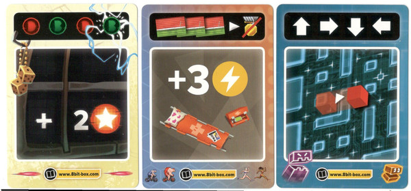 Comprised of 3 "Cheat Code" cards, 1 each for Pixoid, Outspeed, and Stadium, these cheat codes allow you a special surprise ability if your recent plays have matched the required sequence on the card in order to gain a bonus.