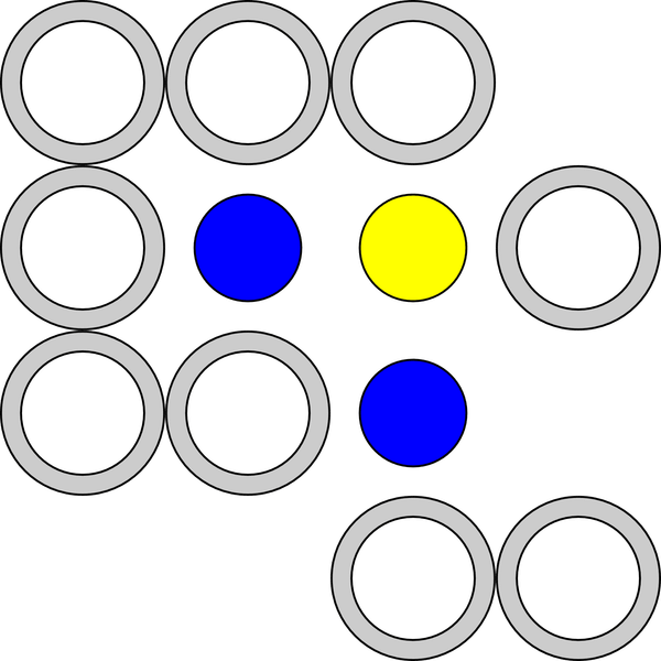Players alternate placing a pawn in a ring and then moving this ring orthogonaly adjacent to another ring. The first player to align 4 pawns in their color in any direction wins the game.