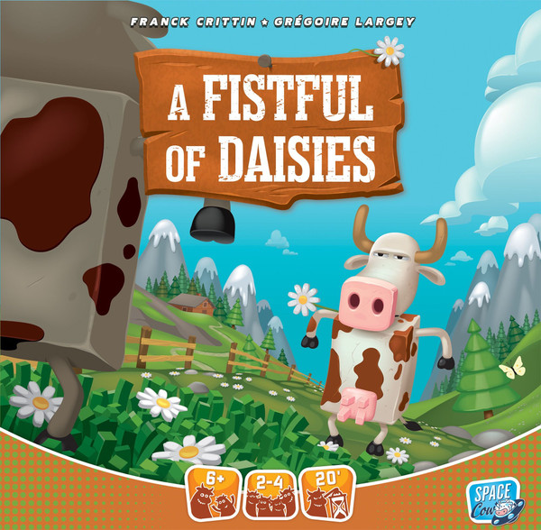 Each cow player starts with a board showing flowers that they want to eat. On a turn, one player rolls the dice, then each player drafts a die in turn. Players then take turns moving their cows, and if they end their movement in a flower field matching a color they want to eat, then they take a token and cover one of those colored spaces on their board. If they land where another cow is located, they must duel! Roll the cows to see who ends up showing more spots; whoever wins collects clover tokens equal to the number of spots you rolled, and as soon as you have at least four clover, you had in four to cover a flower of your choice.