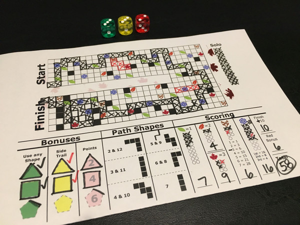 A Walk in the Woods is a print-and-play game that was submitted for the Roll and Write Global Jam 2018. Autumn is the time for taking a relaxing hike in the woods and seeing all the beauty that nature has to offer. In A Walk in the Woods, players take the best path to see as many features as possible and score the most points.