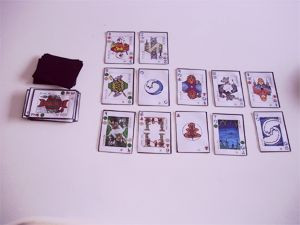 In this solitaire Decktet game, personality cards represent different people in the kingdom who you need to control; personalities are the cards done up like face cards, with two close ups of a single figure. All of the other cards represent elements which you can use to control personalities. Your goal is to "influence" every personality card in the deck by paying one or more cards from your resource row that each share at least one suit with the targeted personality and have a combined value of at least the personality cards value.