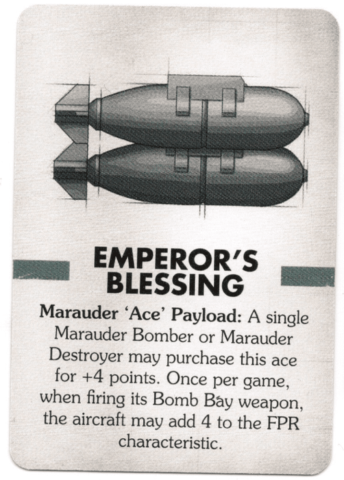 Marauder 'Ace' Payload: A single Marauder Bomber or Marauder Destroyer may purchase this ace for +4 points. Once per game, when firing its Bomb Bay weapon, the aircraft may add 4 to the FPR characteristic.