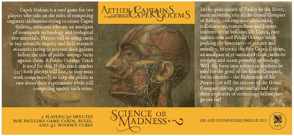 Capek Golems is a card game for two players who take on the roles of competing engineer-alchemists trying to create Capek Golems, creatures who are an amalgam of steampunk technology and biological raw materials. Players will be using cards to buy scientific inquiry and field research resources racing to activate their golems before the tide of public outrage turns against them. A Public Outrage Track is used for this. If this track reaches (25) both players will lose, so they must work cooperatively to keep the public at ease about their experiments while still competing against each other.