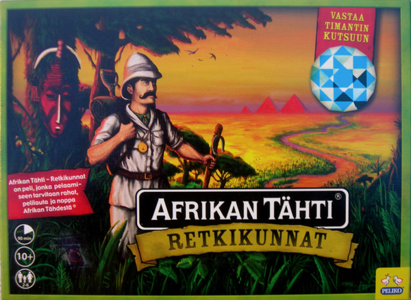 Afrikan tähti - Retkikunnat is an expansion to Afrikan tähti, the most popular Finnish board game. Actually, it's more like a new game, played using the components of the old game. Instead of hunting directly for the treasure, players must first form a team, finding resources and allies. Once the team is ready, players can start hunting for the big diamond.