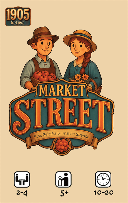 In Market Street, 2–4 players compete to fulfill customer orders by collecting the right goods through lively auctions and cunning hand management. Every round, players bid their limited coins on goods and powerful special cards, trying to outwit their opponents and secure the most lucrative deliveries.