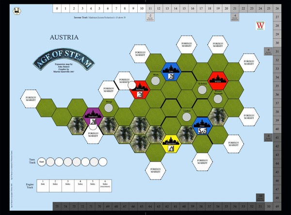 Austria is a 2 player only map and originally appeared in 2005 as part of Age of Steam Expansion: Austria, Switzerland & The Netherlands. It features a completely changed economy with no shares available and three goods shipment phases. This map combines the excellent 2-players rule set by John Bohrer with the Steam Brothers design. Many thanks to John Bohrer for his incredible support!