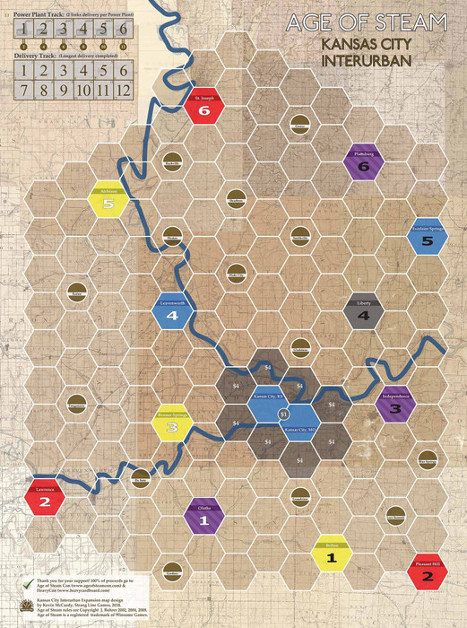This Age of Steam expansion map features a Power Plant track in place of the Engine (Locomotive) track of the base game and requires players to make deliveries equal to or greater than their best delivery. All players start in hexes adjacent to Kansas City and expand outwards. The initial cost for the starting spaces and building a power plant make the beginning game very costly. Players must carefully consider pushing forward for longer deliveries because once they are done, there is no going back to shorter deliveries.