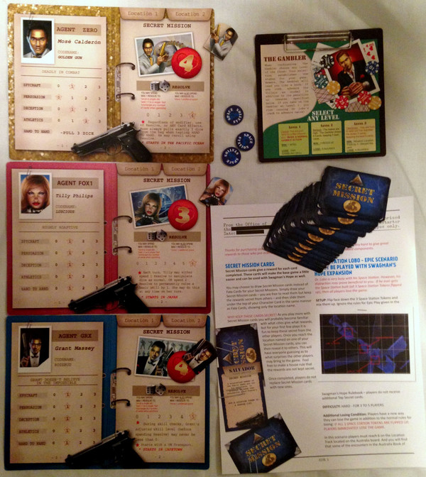 Promotional extras shipped out to Kickstarter backers of Swagman's Hope. These include three new UN characters, a new henchman, a new deck of Secret Mission cards, and an epic Space Station scenario.