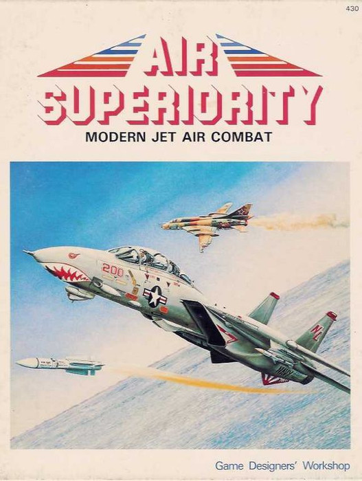 A complex simulation of "modern" air to air jet combat. Each aircraft type has a card with its vital statistics - max speed, ceiling, turn rate, weapons configurations, fuel, etc, etc. Each plane and missile is represented on a hex map by a counter. Each hex is 1/3 mile and each turn is 12-15 seconds. Each aircraft also maintains a paper log throughout the game for altitude, weapons usage, throttle setting, speed, etc etc. Each turn aircraft attempt to spot and/or lock on to opposing craft and move into firing position. Radar search, lock on, and damage results are by CRT with 10 sided die. Damage is by level (light, heavy, critical) and cumulative. There are 30+ base aircraft types and all their variants and 30+ different missiles represented in the game charts. Victory is by scenario.