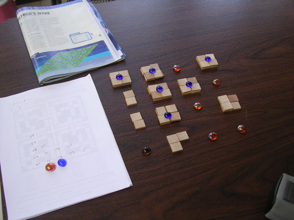 Published in Games Magazine in September 2008, Alfred's Wyke is a two player game where one plays the Builder, the other the Destroyer. Square tiles are place in 2×2 plots that are arranged on a 4×4 grid (except for one pair of opposite corners that start with just 3 tiles). The Builder tries to build up two-story "houses" (2×2×2), while the Destroyer tries completely demolish buildings in order to create empty plots (2×2×0). On each turn, the players select from a menu of five tile placement/removal options: