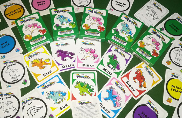 If you're playing with 2 players, choose 4 Alicorns each. If you're playing with 3 or 4 players, choose 2 Alicorns each. If you have 5-8 players, choose 1 Alicorn each. Each card moves all the Alicorns illustrated on the card forward by one space. Each turn, starting with the youngest player and going clockwise, draw a card from the scattered and turned deck and move ALL the Unicorns with that characteristic or r don't use that card. The first Alicorn to cross the finish line... Is the winner!
