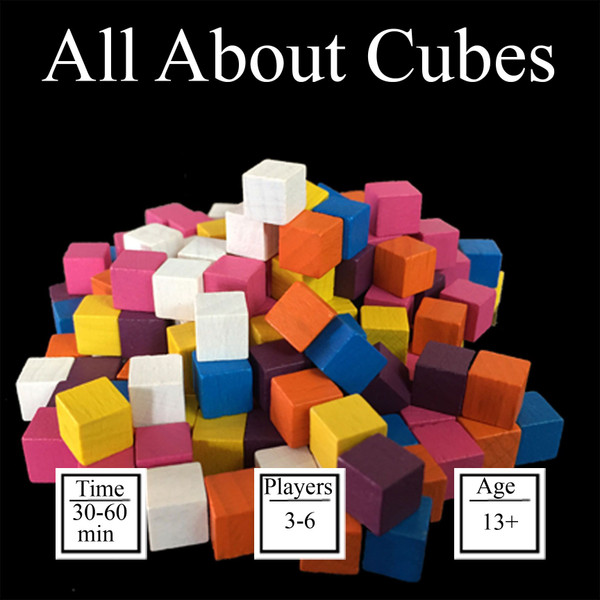 All About Cubes is a placement game that uses temporary alliances, strategy, and board actions to screw over who you think is in first. Discussion, deals, persuasion, and even temporary treaties to take down first place are allowed and encouraged, but no deal is ever binding. Turns are fast in this game, but there is still strategic depth. Players will attempt to take control of tiles to gain special abilities, which will either help themselves or hurt their opponents.