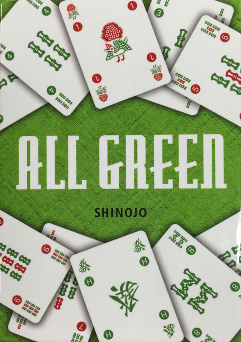 ALL GREEN is a card game that simplifies the rules and play of Japanese Mahjong by reducing the types of cards and scoring hands. This edition is very portable, with two decks of small sized cards. One deck is the Tenbo cards, showing scoring points in values of 10P, 5P and 1P. The other deck is only the green bamboo suite (Ryuiso), hence the game being called all Green. The other Mahjong suites and tiles, such as Dragons, are not represented.