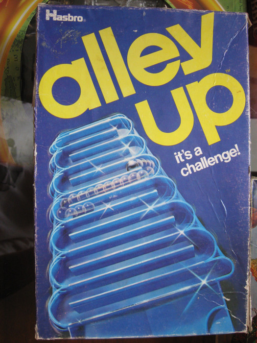 This is a very simple but challenging game. It consists of a hard plastic board with a zigzag path and a leg that can be placed in the back in different positions. The board is shaped in such a way that it can be rocked from side to side. A steel marble is placed at the bottom of the path and by rocking the board the marble can be maneuvered up to the top. The leg in the back of the board makes it angle up at the top. Each position has a corresponding score, the higher the score the steeper the angle. Players take turns and score points for each successful trip up the board. If a player loses control and allows the marble to come all the way back down his turn is over. The player with the highest score after a pre-determined number of turns wins.