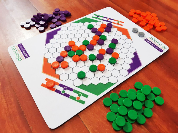 This tricky game requires you to connect opposite sides of the board: purple to purple, orange to orange, green to green. To make those connections, you must use the colour matching the sides you are connecting… but your allied colour also works!