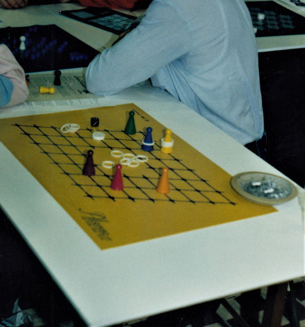 The players move their pawns on a grid, determined by dice rolls. They are trying to reach a location chip which was assigned a location (for instance, an hotel, an airport lounge, a living room etc.). The first two players to reach the chip have to have a verbal argument befitting that location. The third player takes one side. The other player(s) have to decide who is the winner. That winner gets a ring over the pawn (so does a player who took the right side); the loser places and names the location chip again. The first player to have three rings is the winner.