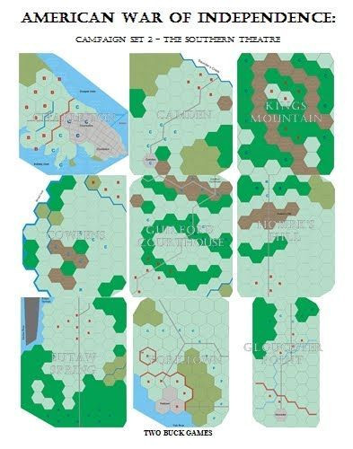 Battles included in this set include Charleston, Cowpens, Eutaw Springs, Camden, Guildford Courthouse, Kings Mountain, Hobkirk Hill, Yorktown, Gloucester Point, and Cornwallis breaks out (hypothetical scenario).