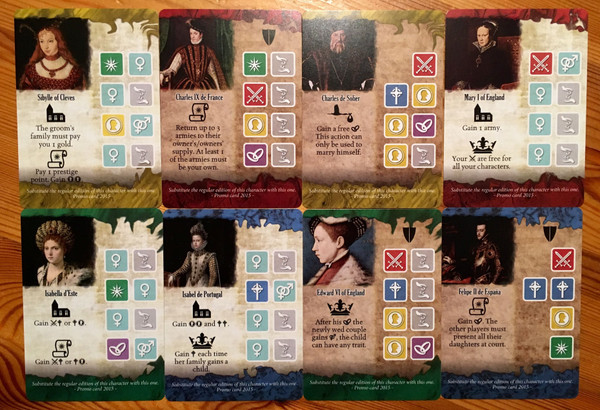 The new cards include Sybille of Cleves, Charles IX de France, Charles de Solier, Mary I of England, Isabella d'Este, Isabel de Portugal, Edward VI of England, and Felipe II de España.