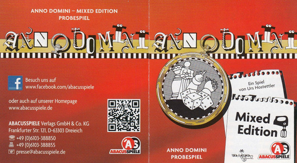This small expansion set Anno Domini - Mixed Edition was a free giveaway by the publisher. It only contains 12 event cards out of 72 mixed cards without a common theme. Since this is not enough for a real game, it only comes with a brief summary of the gameplay. Those six different bags of cards can be recognized by the number of each of the first card in a bag: U001, U013, U025, U037, U049, U061.