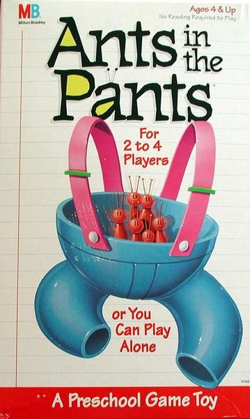 This is a very simple game consisting of a dog wearing very large pants which stands in the middle of the playing area and plastic ants. The ants are stiff with a short tail and folded down the middle so the legs touch the ground while the body is up. By pressing on the tail and letting your finger slide of the ant will jump, sometimes quite high. Players simultaneously try to jump their ants into the dog’s pants. The first one to get all their ants in wins.