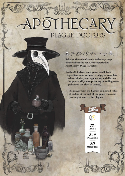 In this 2-4 player card game you’ll draft ingredients and actions to help you complete orders, hinder your opponents, and distract the guards (if you’re planning on selling some poison on the side). The player with the highest combined value of orders at the end of the game wins and just might survive the plague.