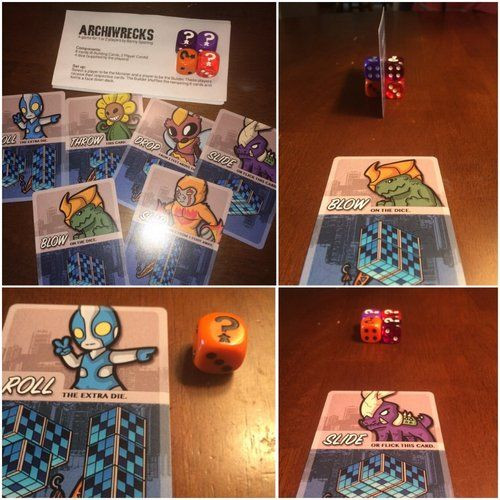 ArchiWrecks is a card and dice game for 2 players: the architect that builds the city, and a giant monster that is attempting to smash the city.
