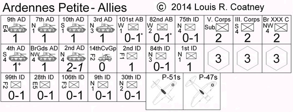 Ardennes Petite (Ardennes Small) is a very small-scale - only 6 hexes to Namur! - eight 2-day turn (16Dec44-2Jan45) division-to-corps-level Battle of the Bulge minigame, designed as a half-hour-lunch game.