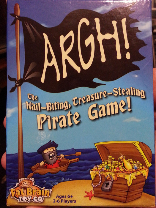 Argh! is a press-your-luck pirate-themed card game where players randomly draw face-down cards spread out in a center playing area. The goal of the game is to collect treasure cards and score points. A player only scores points when they decide to end their turn and the total number of points awarded to the player is based on the number of treasure cards they have in front of them. Some treasure only scores points when the player has 3 or more of the same type. Included in the cards are 8 Pirates that will steal all scorable treasure from the player if drawn before they end their turn. There are also a few cards that allow a player to steal treasure from their opponents.
