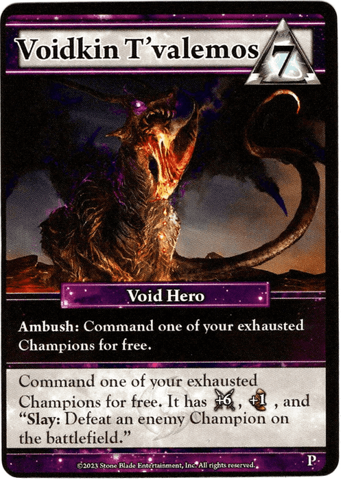 Effect: Command one of your exhausted Champions for free. It has +6 Strength, +1 bonus Speed, and "Slay: Defeat an enemy Champion on the battlefield."