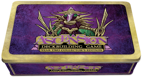 A follow-up to the Ascension: Year One Collector's Edition, Ascension: Year Two Collector's Edition includes foil editions of every card from Storm of Souls and Immortal Heroes, as well as the associated promo cards. Each Ascension Collector's Edition comes in a metal tin and includes a special playing board.