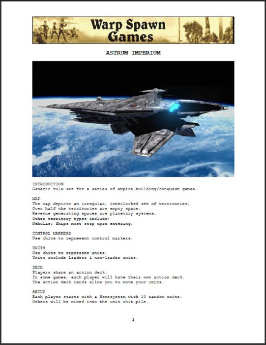 A game of empire building and conquest in outer space. Each player starts with a home system and ten random units. The players explore space searching for new planets, establish diplomatic relations with inhabited planets, and build colonies to bring in revenue. Revenue is required to maintain fleets and train new leaders. As the empires of the players become more technologically advanced, they gain access to more sophisticated spacecraft and installations.