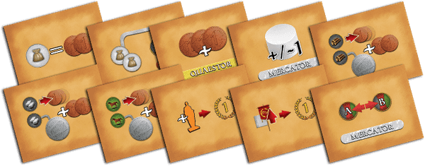 Magistratus gives each player a special ability that he/she has throughout the current game. Before the beginning of the game, shuffle all the cards and hand out two to each player. Each player should keep one, the other one goes back to the game box. Choose a side on the selected card and place it in front of you, next to your player board. Proceed with the game setup as described in the rulebook.