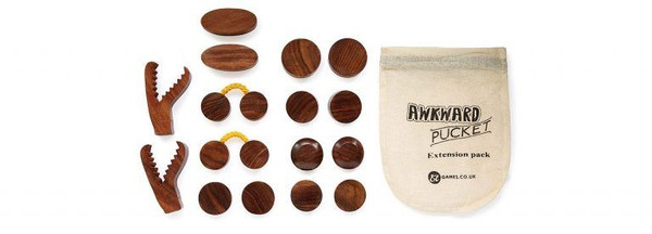 The Awkward pucks include: the flying saucer, whose rounded edges cause it to fly up when fired; the fatboy, who only just fits through the gate; the wedgie, specially shaped to wedge under the elastic on the other side; the long face, who only fits through longways; the crab’s claw, that must be fired wrist-first; the two timer, which forces you to get two pucks through at once; and the lopsidewinder, whose embedded weight makes it swerve off to one side. The pack includes two of each kind of puck plus instructions.