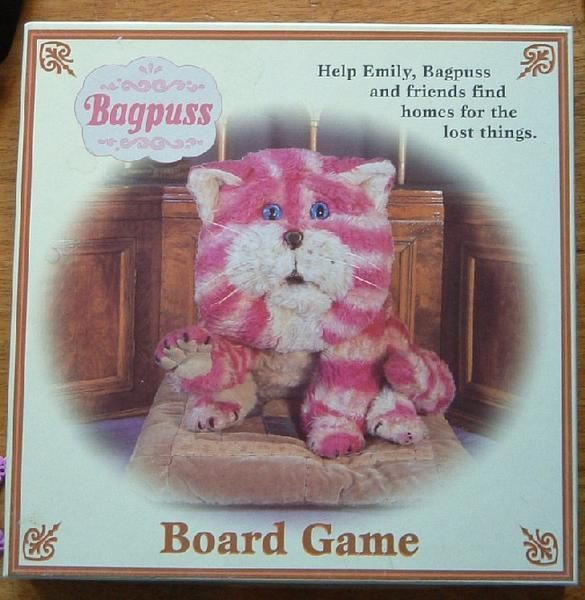This game is based on the children’s TV series, Bagpuss about an old toy cat and his friends; toys that come to life to study the lost things their owner Emily brings into her special shop. Players move around the board taking penalties, extra goes or collecting cards with pictures of one or more of the characters from the series on them. Whenever a player has a complete set of all of the characters they can trade them in for a card from the 'lost things' pile. When all of the lost things have been drawn the player with the most wins.