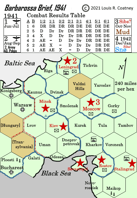 VERY small footprint Barbarossa game. Like Philip Sabin's classic Eastern Front, only **3** hexes from Warsaw to Moscow, although a different configuration of those.