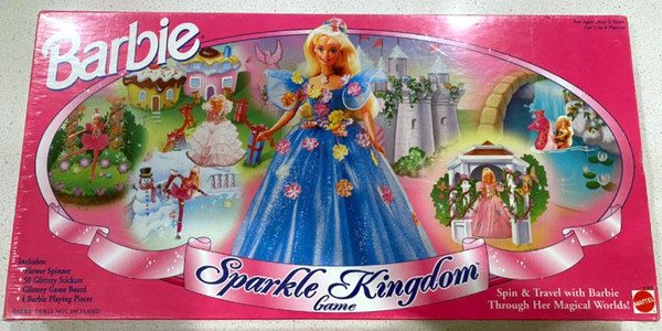 The Barbie Sparkle Kingdom game is very much like a Barbie themed Candyland. Rather than drawing cards with colors on them, the player spins a spinner, chooses a flower on the spinner, looks under the flower for the color and moves their piece to the next space on the board of that color. If that space has a flower, the player gets another turn. If the player lands on a bumble bee, they have to go back to the spot of the previous bumble bee on the board. There are short cuts (Rainbow Bridge, Butterfly Trail, Crystal Path) to speed you along your route. The winner is the player to be the first to Barbie's Jeweled Palace.