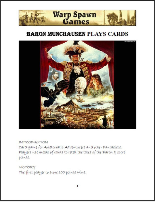 “Card game for Aristocratic Adventurers and other Fantasists. Players use melds of cards to retell the tales of the Baron & score points. Victory: The first player to score 100 points wins.”