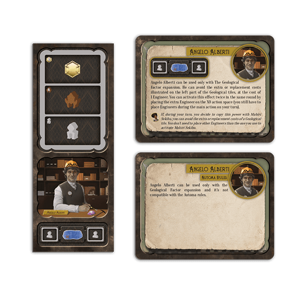Angelo Alberti can be used only with The Geological Factor expansion, He can avoid the extra or replacement costs illustrated on the left part of the Geological tiles, at the cost of 1 Engineer. You can activate this effect twice in the same round by placing the extra Engineer on the XO action space (you still have to place Engineers during the main action on your turn).