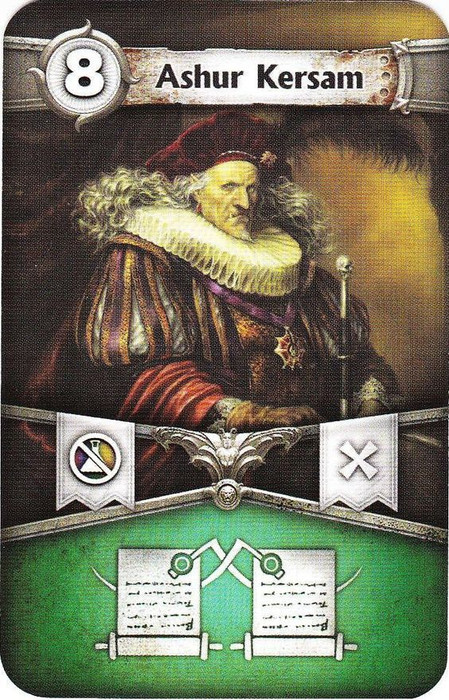 Ashur Kersam promo card for Bastion, available at Essen Spiel 2015. Language independent. Value of 8, archmage, legendary enemy. When in play, no alchemy spells can be used.