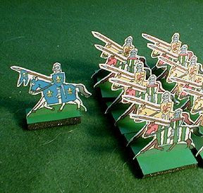 A miniatures wargame intended for classroom use with two teams of students (grades 6-8). The game is designed to be played on a 5x5 foot table using 1/72 scale plastic miniatures mounted two per stand. Free print-and-play paper miniatures are also provided for use with the rules. Units portrayed in the game include commanders, mounted knights, crossbowmen, longbow men, and infantry.