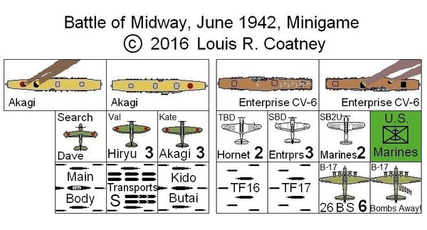 This is an even simpler, air group version (for me and my 8 year old son to play) of my squadron level 1990 game Deadly Reckoning, which I am in the process of revising/updating. It nonetheless seems to have all the essential elements and decision points of a depthy Midway game.