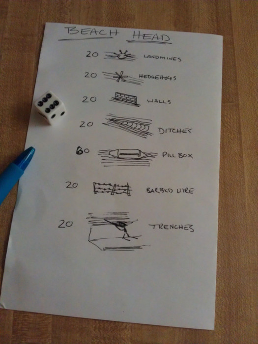 “Solo dice game simulating the actions on a small section of the Normandy Beach landings in WWII. Objective: The game ends when the Allies remove all German Bunkers and Trenches. Removed may mean ‘cleared of troops’ in the case of Bunkers and trenches or ‘Punching through gaps’ for Traps, wire, walls, mine-fields, & ditches. Scoring: Keep track of Allied Infantry casualties. A lower score is a better one.”