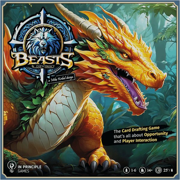 Beasts and Diplomacy is a card drafting, tableau-building game where players become Knights of the land of Aterra, competing to assemble the best Exhibition of wild and rare Beasts that appeal to the Diplomats of the land. Players must also try to fulfill their secret Quests while ensuring they have enough Ore to maintain their ever-growing Maintenance costs. Like many card drafting games, Beasts and Diplomacy offers interactions like players taking cards before others can get to them, however, unlike other drafting games the design focus isn't on scarcity, but on opportunity. As you play you will have to constantly react to your opponents' actions and formulate new short term plans to achieve your long term goal of having the most balanced Exhibition. When one door closes, several new ones open. It's up to you to find your own path.