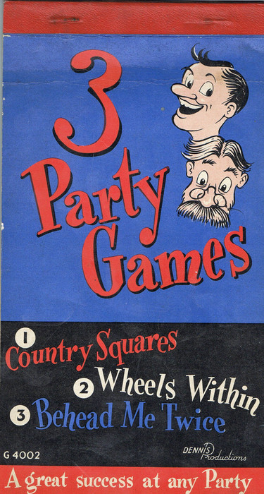 On this sheet are clues to two words. However there ia third word, which is the correct answer to the clue. By this I mean, each word, beheaded (i.e. with the first letter knocked off), gives another word, and this beheaded again, gives a third word. Clues to the first word and the last word are given. The players must work out the middle word. An example;