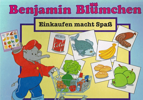 Each player gets a board with 16 squares, all illustrated with things Benjamin needs at the supermarket. The item tiles are shuffled and placed in a face-down stack. A turn starts when the player reveals the top tile. If he thinks he needs it, he pays to the bank the cost (in Deutschmarks). If he doesn't want to buy it, the next player can, and at a saving of 50 Pfennigs (half a Deutschmark). If not wanted it is offered to all the other players, knocking off 50 Pfennigs each time. If it gets down to zero, that player will get it for free.